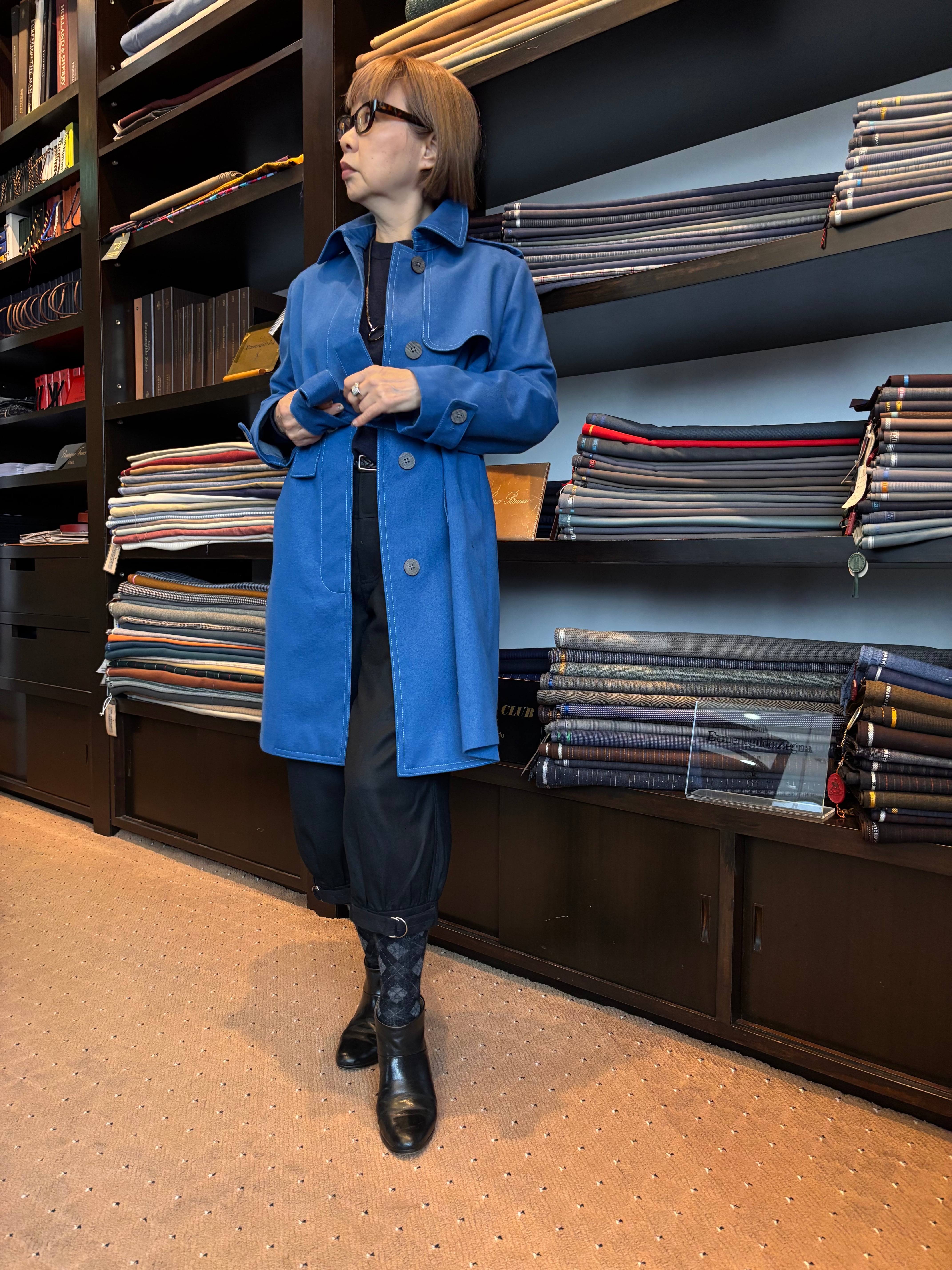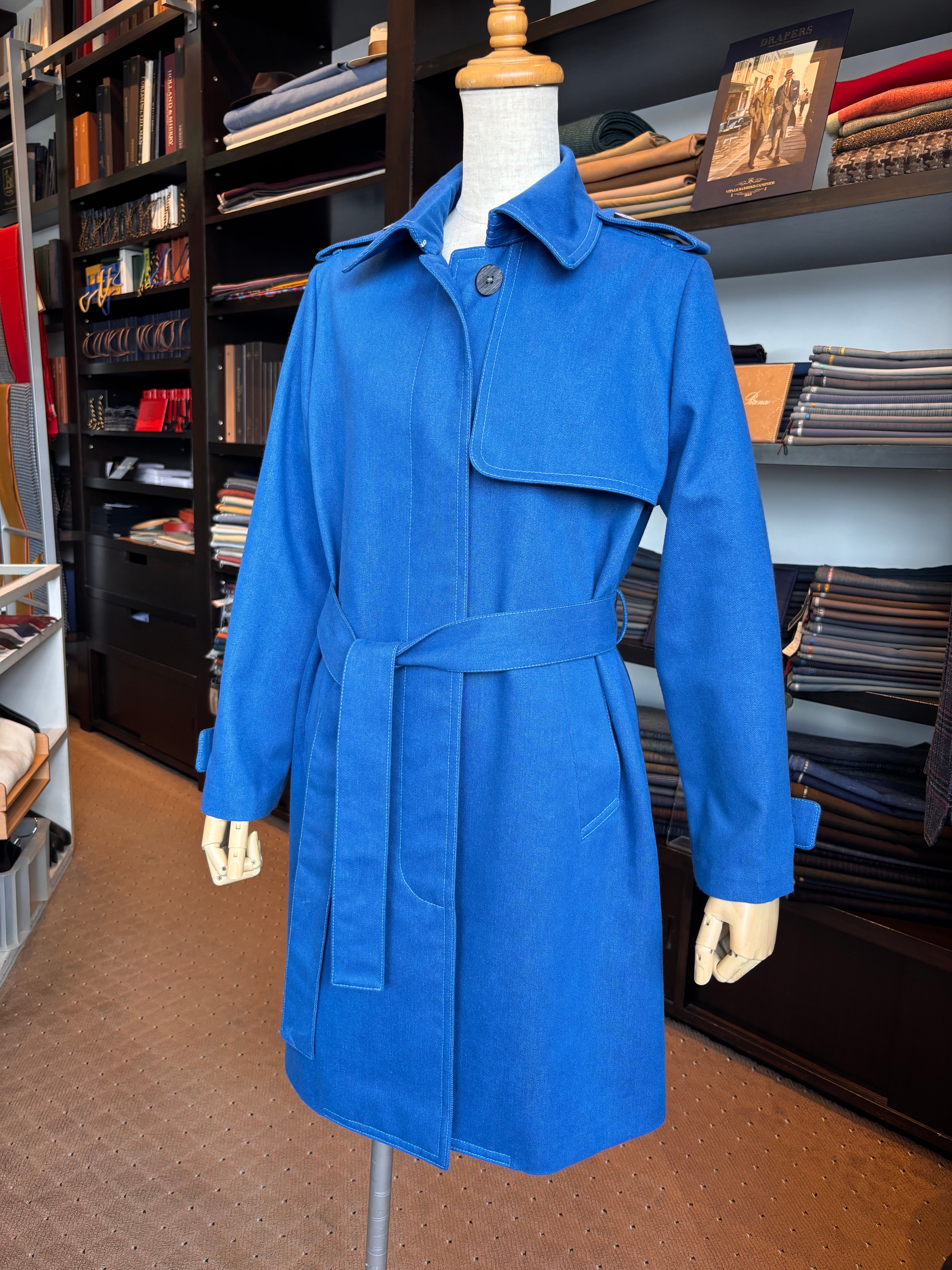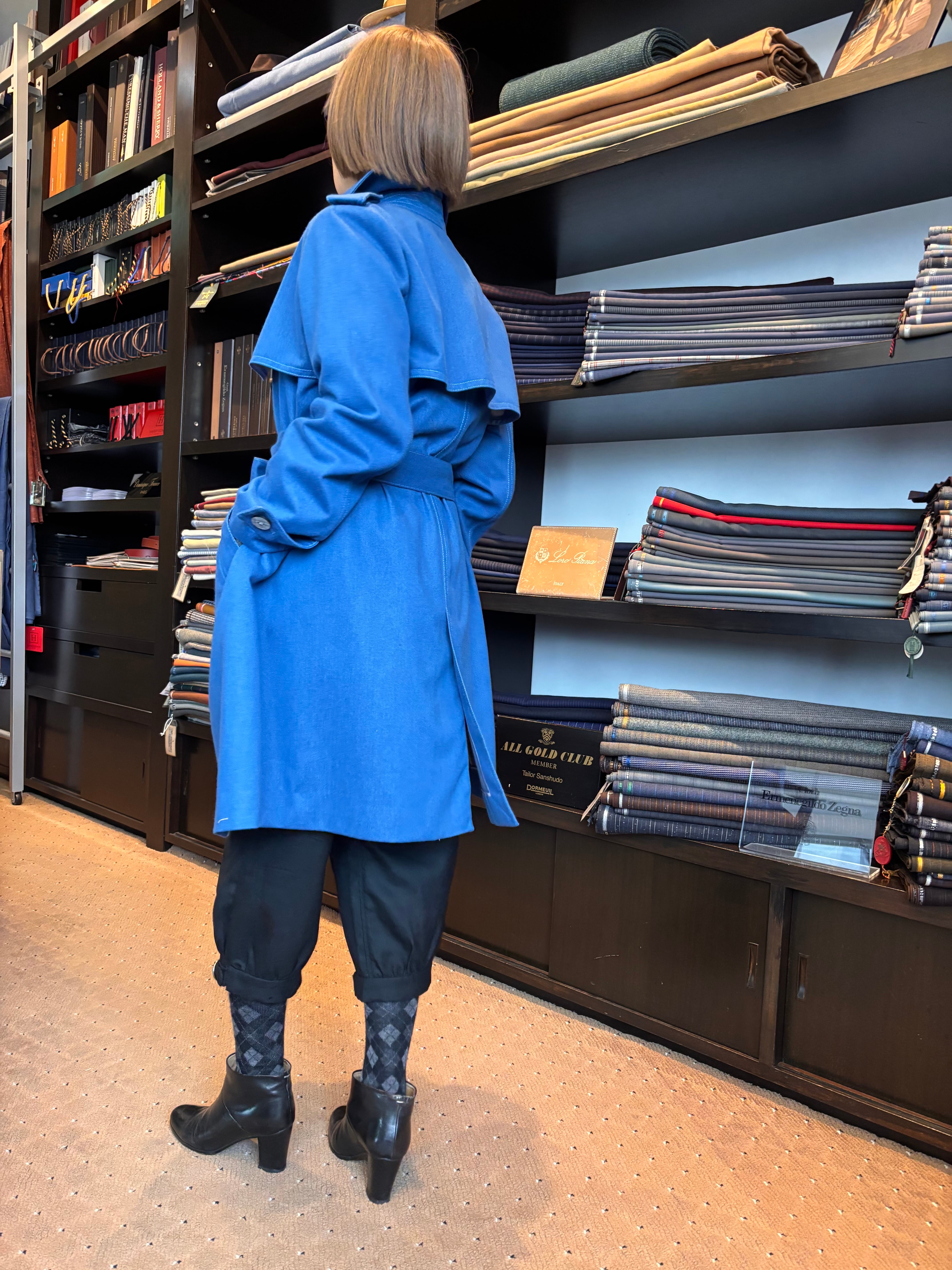 英国ホーランド&シェリー社の高級ブルーデニムを魅力的に纏った「デニムトレンチコート」は、エレガントさとトレンド感を兼ね備えた一着です。このコートは、胸のガンフラップや肩章(エポーレット)、背のストームフラップを取り入れたデザインで、スタイリッシュな印象を与えます。