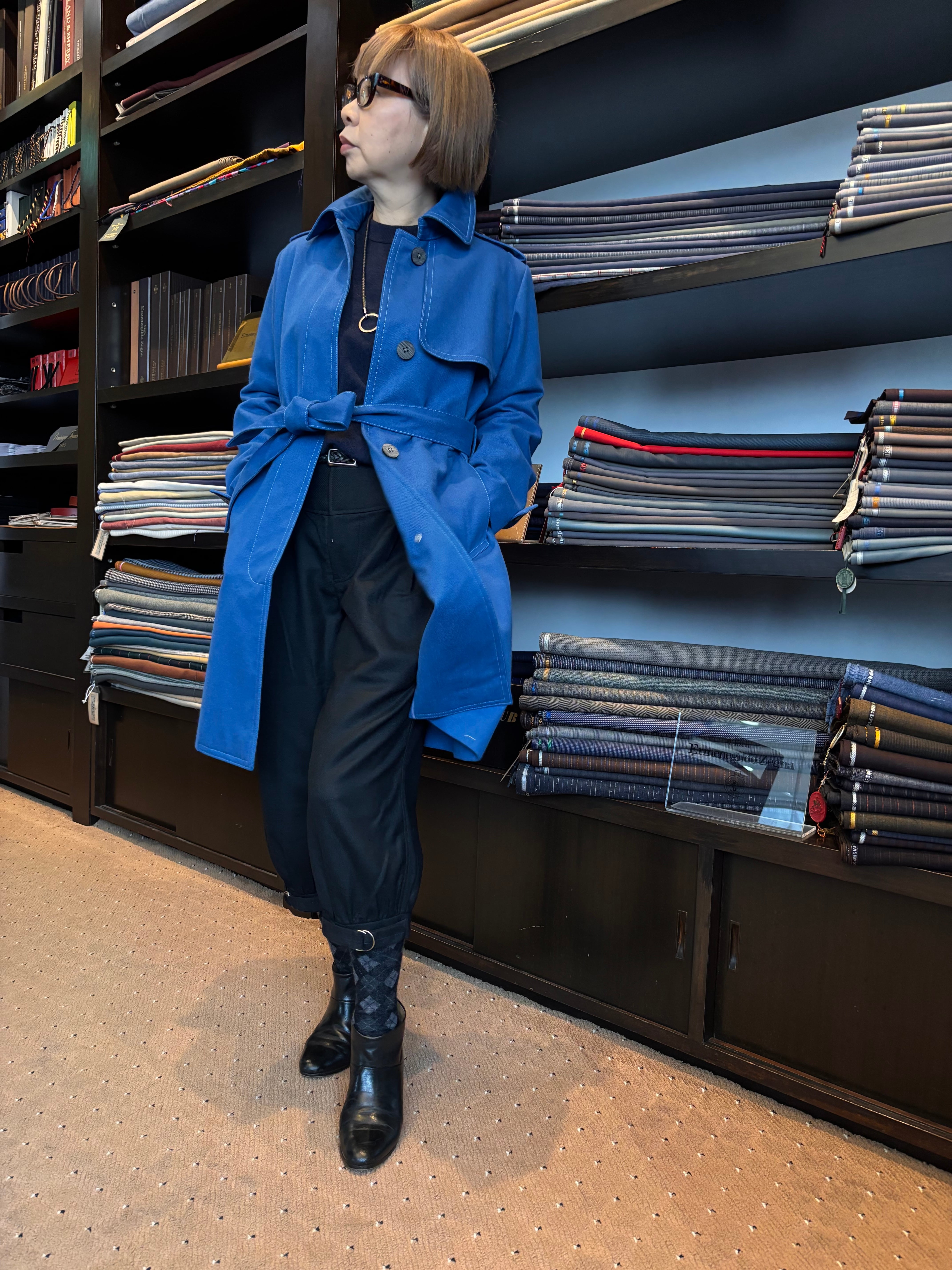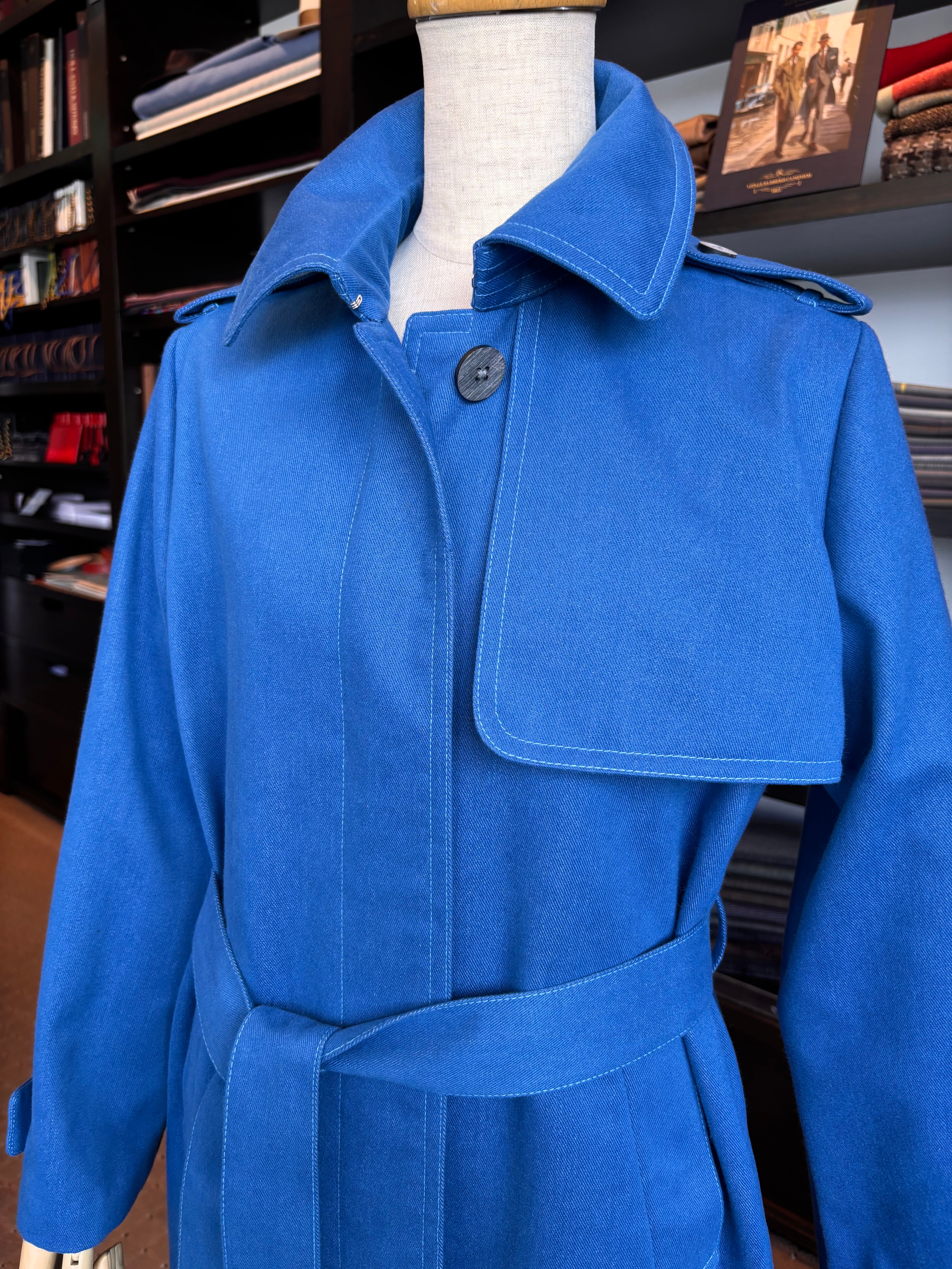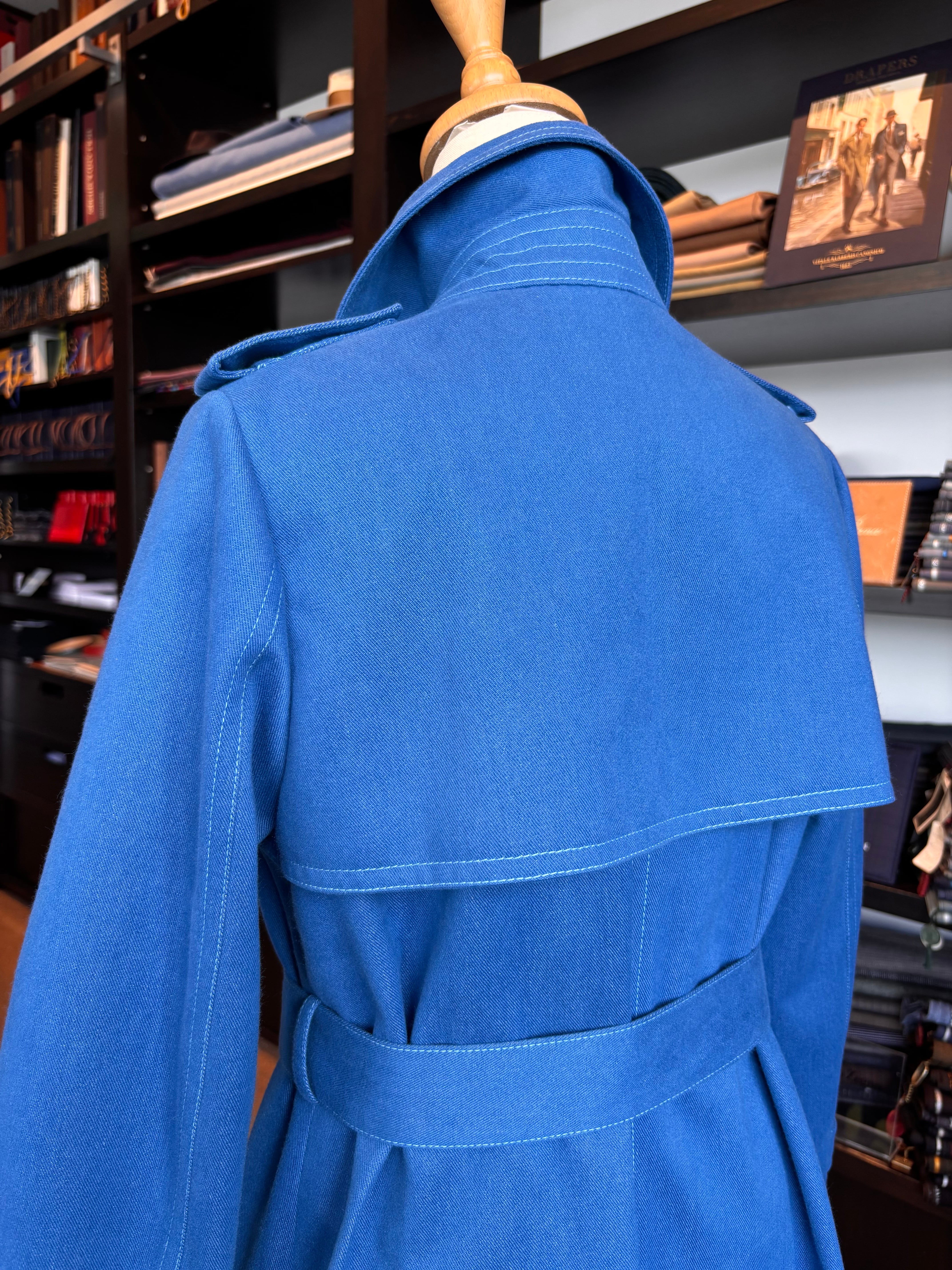 英国ホーランド&シェリー社の高級ブルーデニムを魅力的に纏った「デニムトレンチコート」は、エレガントさとトレンド感を兼ね備えた一着です。このコートは、胸のガンフラップや肩章(エポーレット)、背のストームフラップを取り入れたデザインで、スタイリッシュな印象を与えます。